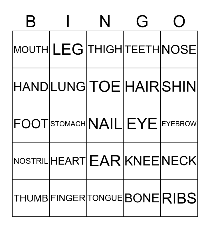 This bingo card has a free space and 24 words: HEART, FINGER, TOE, THUMB, NOSE, MOUTH, HAND, LEG, EYE, EAR, HAIR, FOOT, KNEE, NECK, LUNG, BONE, EYEBROW, THIGH, SHIN, STOMACH, RIBS, NOSTRIL, TEETH and TONGUE.