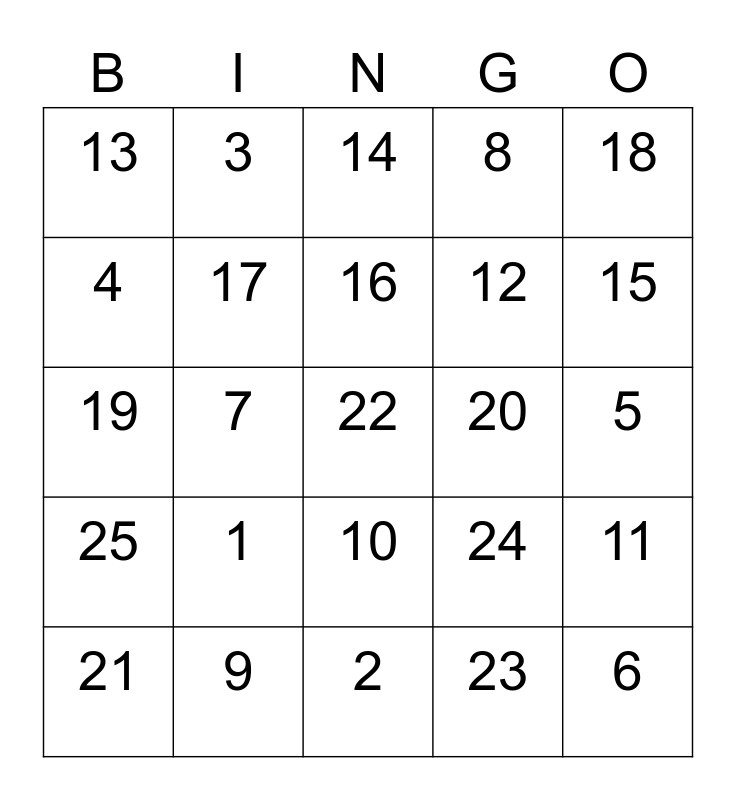 This bingo card has 25 words: 1, 2, 16, 21, 18, 13, 4, 3, 20, 10, 12, 19, 24, 11, 17, 6, 5, 14, 15, 7, 22, 9, 25, 8 and 23.