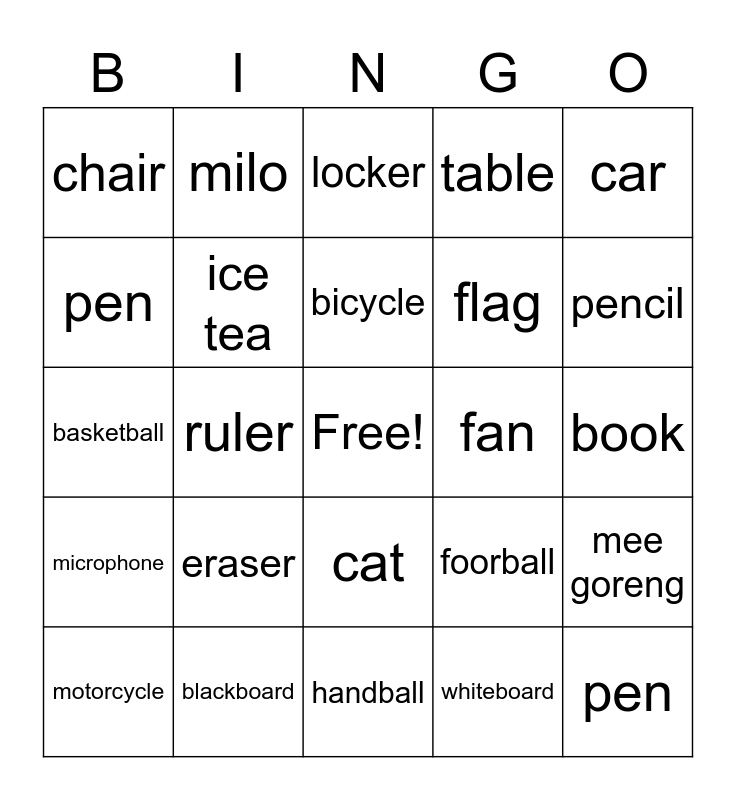 This bingo card has a free space and 24 words: eraser, blackboard, bicycle, motorcycle, car, chair, pen, milo, fan, cat, flag, basketball, foorball, mee goreng, ice tea, whiteboard, book, locker, pencil, ruler, pen, microphone, table and handball.