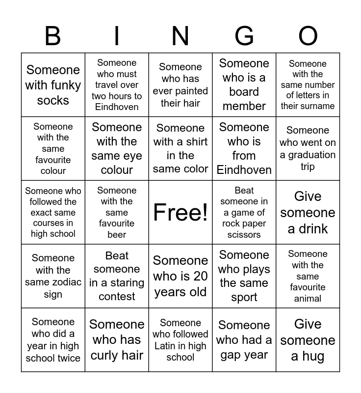 This bingo card has a free space and 39 words: Someone with a driver's license, Someone from the same province, Someone with the same shoesize, Someone with the same eye colour, Someone who did a year in high school twice, Someone who is 20 years old, Someone with a shirt in the same color, Someone with the same birth month, Someone with the same number of letters in their surname, Someone with the same zodiac sign, Someone with the same favourite beer, Someone who is a board member, Give someone a hug, Give someone a drink, Beat someone in a game of rock paper scissors, Beat someone in a staring contest, Someone who had/has to resit one of his final exams, Someone with funky socks, Someone with the same phone, Someone who plays the same sport, Someone with the same favourite colour, Someone who followed Latin in high school, Someone who is from Eindhoven, Someone who went on a graduation trip, Someone who has been to Southeast Asia, Someone who had to bike more than 8km to school, Someone who is exactly 183cm tall, Someone with freckles, Someone who has never been to Eindhoven before, Someone who must travel over two hours to Eindhoven, Someone who already studies at the TU/e, Someone who has lived abroad, Someone who has ever painted their hair, Someone who has curly hair, Someone who had a gap year, Someone who snowboards, Someone with the same favourite animal, Someone who followed the exact same courses in high school and Same favourite band/artist.