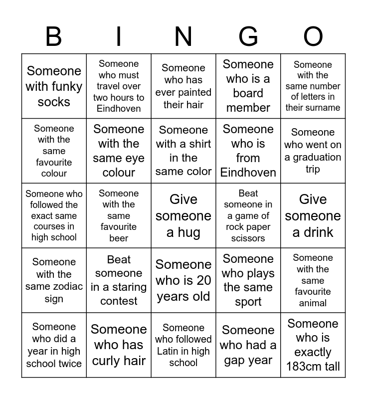 This bingo card has 39 words: Someone with a driver's license, Someone from the same province, Someone with the same shoesize, Someone with the same eye colour, Someone who did a year in high school twice, Someone who is 20 years old, Someone with a shirt in the same color, Someone with the same birth month, Someone with the same number of letters in their surname, Someone with the same zodiac sign, Someone with the same favourite beer, Someone who is a board member, Give someone a hug, Give someone a drink, Beat someone in a game of rock paper scissors, Beat someone in a staring contest, Someone who had/has to resit one of his final exams, Someone with funky socks, Someone with the same phone, Someone who plays the same sport, Someone with the same favourite colour, Someone who followed Latin in high school, Someone who is from Eindhoven, Someone who went on a graduation trip, Someone who has been to Southeast Asia, Someone who had to bike more than 8km to school, Someone who is exactly 183cm tall, Someone with freckles, Someone who has never been to Eindhoven before, Someone who must travel over two hours to Eindhoven, Someone who already studies at the TU/e, Someone who has lived abroad, Someone who has ever painted their hair, Someone who has curly hair, Someone who had a gap year, Someone who snowboards, Someone with the same favourite animal, Someone who followed the exact same courses in high school and Same favourite band/artist.