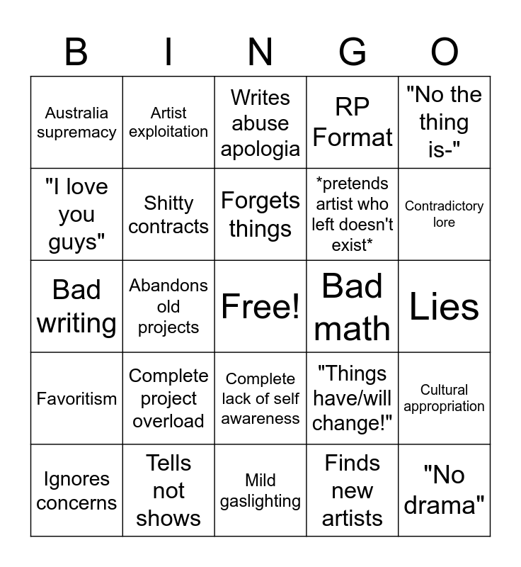 This bingo card has a free space and 24 words: Complete project overload, Tells not shows, Forgets things, Ignores concerns, "No the thing is-", Australia supremacy, "I love you guys", Artist exploitation, Bad math, Complete lack of self awareness, *pretends artist who left doesn't exist*, Bad writing, "Things have/will change!", Cultural appropriation, Shitty contracts, Finds new artists, Lies, Writes abuse apologia, Contradictory lore, Abandons old projects, "No drama", Favoritism, RP Format and Mild gaslighting.