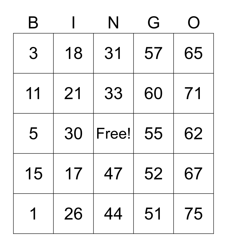 This bingo card has a free space and 24 words: 1, 17, 33, 51, 65, 3, 18, 31, 55, 62, 5, 21, 52, 67, 11, 26, 44, 57, 71, 15, 30, 47, 60 and 75.