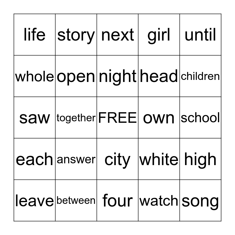 This bingo card has a free space and 24 words: answer, between, night, leave, until, life, whole, story, own, city, head, saw, white, high, open, watch, school, next, children, together, song, each, girl and four.
