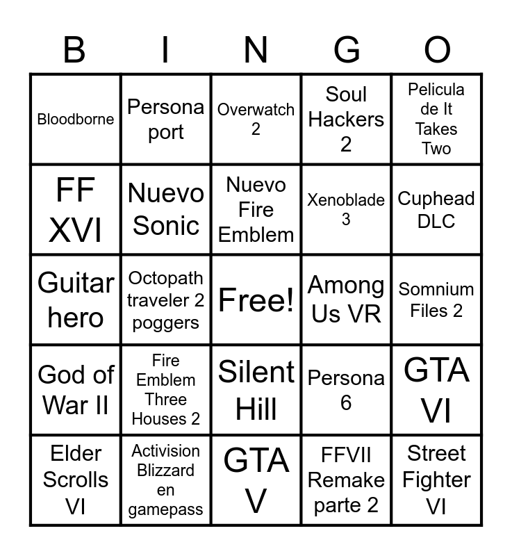 This bingo card has a free space and 24 words: Fire Emblem Three Houses 2, Activision Blizzard en gamepass, Nuevo Fire Emblem, Elder Scrolls VI, Pelicula de It Takes Two, Bloodborne, FF XVI, Persona port, Among Us VR, Silent Hill, Xenoblade 3, Guitar hero, Persona 6, GTA VI, Nuevo Sonic, FFVII Remake parte 2, Somnium Files 2, Overwatch 2, Cuphead DLC, Octopath traveler 2 poggers, Street Fighter VI, God of War II, Soul Hackers 2 and GTA V.
