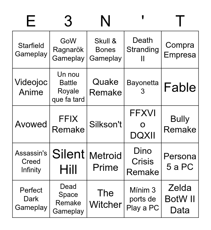 This bingo card has a free space and 24 words: Silent Hill, Dead Space Remake Gameplay, Quake Remake, Perfect Dark Gameplay, Compra Empresa, Starfield Gameplay, Videojoc Anime, GoW Ragnarök Gameplay, FFXVI o DQXII, Metroid Prime, Bayonetta 3, Avowed, Dino Crisis Remake, Persona 5 a PC, Un nou Battle Royale que fa tard, Mínim 3 ports de Play a PC, Bully Remake, Skull & Bones Gameplay, Fable, FFIX Remake, Zelda BotW II Data, Assassin's Creed Infinity, Death Stranding II and The Witcher.