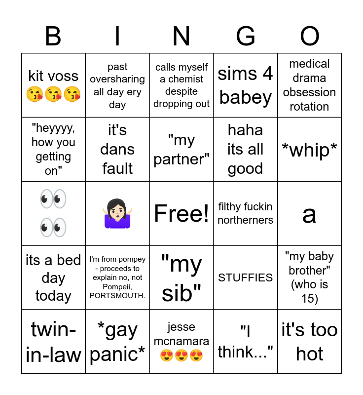 This bingo card has a free space and 24 words: I'm from pompey - proceeds to explain no, not Pompeii, PORTSMOUTH., *gay panic*, "my partner", twin-in-law, medical drama obsession rotation, kit voss 😘😘😘, "heyyyy, how you getting on", past oversharing all day ery day, filthy fuckin northerners, "my sib", haha its all good, 👀👀, STUFFIES, "my baby brother" (who is 15), it's dans fault, "I think...", a, calls myself a chemist despite dropping out, *whip*, 🤷🏻♀️, it's too hot, its a bed day today, sims 4 babey and jesse mcnamara 😍😍😍.
