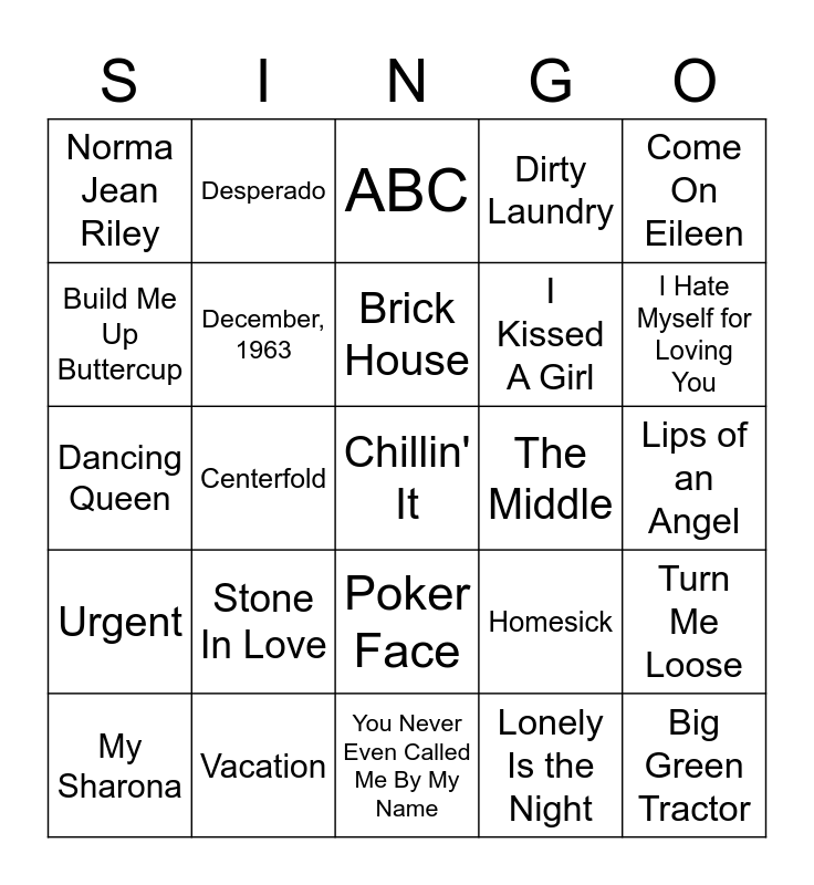 This bingo card has 76 words: Free!, 9 to 5, ABC, Back Where I Come From, Bad Moon Rising, Bad Romance, Bait A Hook, Beer Money, Before He Cheats, Bette Davis Eyes, Big Green Tractor, Blue Clear Sky, Brick House, Build Me Up Buttercup, Carry On Wayword Son, Centerfold, Chapel of Love, Chillin' It, Closer, Come On Eileen, Cruise, Dancing Queen, December, 1963, Desperado, Dirty Laundry, Downtown, Family Tradition, Fancy, Get Along, God Bless the USA, Good Vibes, Heaven's On Fire, Here For the Party, Homesick, I Hate Myself for Loving You, I Kissed A Girl, John Deere Green, I Want You To Want Me, Lips of an Angel, Lonely Is the Night, Lonesome Loser, Margaritaville, Midnight Blue, My Best Friend's Girl, My Front Porch Looking In, My House, My Sharona, Norma Jean Riley, One More Drinkin' Song, Parking Lot Party, Picture, Poker Face, Pontoon, Private Eyes, Since You Been Gone, Slide, Slow Ride, Some Kind of Wonderful, Somebody Told Me, Stacy's Mom, Stone In Love, Sunglasses At Night, Take Me Home Tonight, Tender is the Night, Tequila Makes Her Clothes Fall Off, That's My Kind of Night, The Middle, TiK Tok, Til You Can't, Tonight Tonight, Turn Me Loose, Urgent, Vacation, Why We Drink, You Never Even Called Me By My Name and You Sexy Thing.