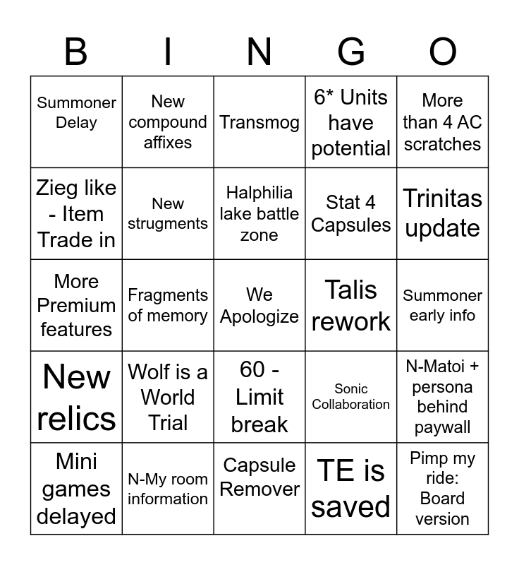 This bingo card has a free space and 24 words: Wolf is a World Trial, N-My room information, Halphilia lake battle zone, Mini games delayed, More than 4 AC scratches, Summoner Delay, Zieg like - Item Trade in, New compound affixes, Talis rework, 60 - Limit break, Stat 4 Capsules, More Premium features, Sonic Collaboration, N-Matoi + persona behind paywall, New strugments, TE is saved, Summoner early info, Transmog, Trinitas update, Fragments of memory, Pimp my ride: Board version, New relics, 6* Units have potential and Capsule Remover.