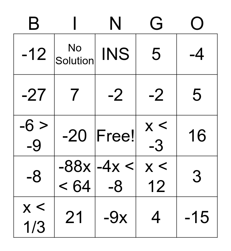 This bingo card has a free space and 32 words: 4, -4, -20, -10, -8, 7, -4, 3, No Solution, -15/2, -2, INS, 12, x > -11, x < -3, x < 8/3, x < 1/3, -6 > -9, -4x < -8, -88x < 64, x < 12, x > 30, 16, 21, -15, 5, -2, -27, -12, -9x, - and 5.