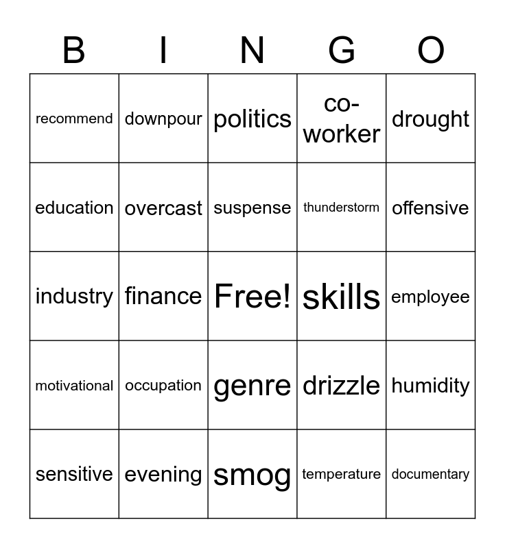 This bingo card has a free space and 29 words: sensitive, casual, finance, environment, recommend, politics, overcast, occupation, skills, evening, employee, documentary, smog, temperature, offensive, information, genre, motivational, drought, industry, drizzle, sitcom, thunderstorm, education, co-worker, downpour, humidity, suspense and controversial.