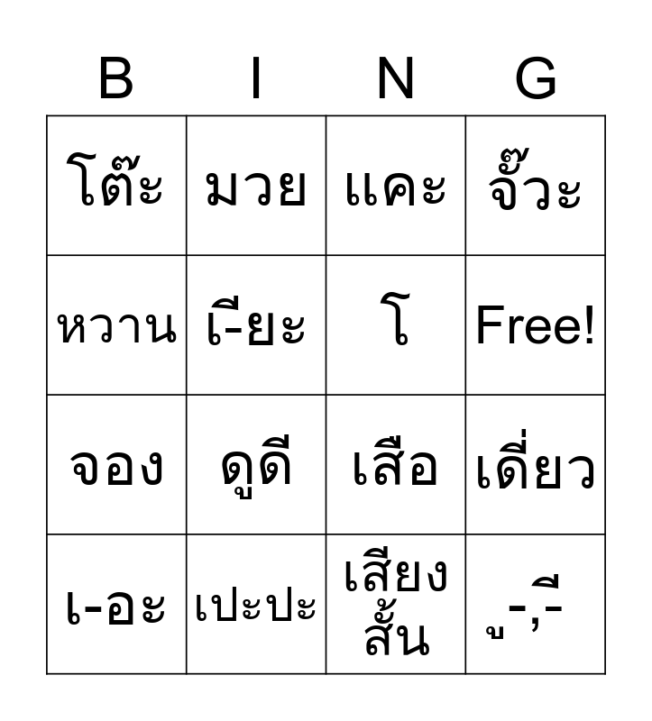 This bingo card has 17 words: เสียงสั้น, เ-อะ, แคะ, โต๊ะ, ดูดี, จั๊วะ, เดี่ยว, โ, Free!, เ-ียะ, เปะปะ, เสือ, หวาน, มวย, จอง, โกโกวา and ู-,-ี.