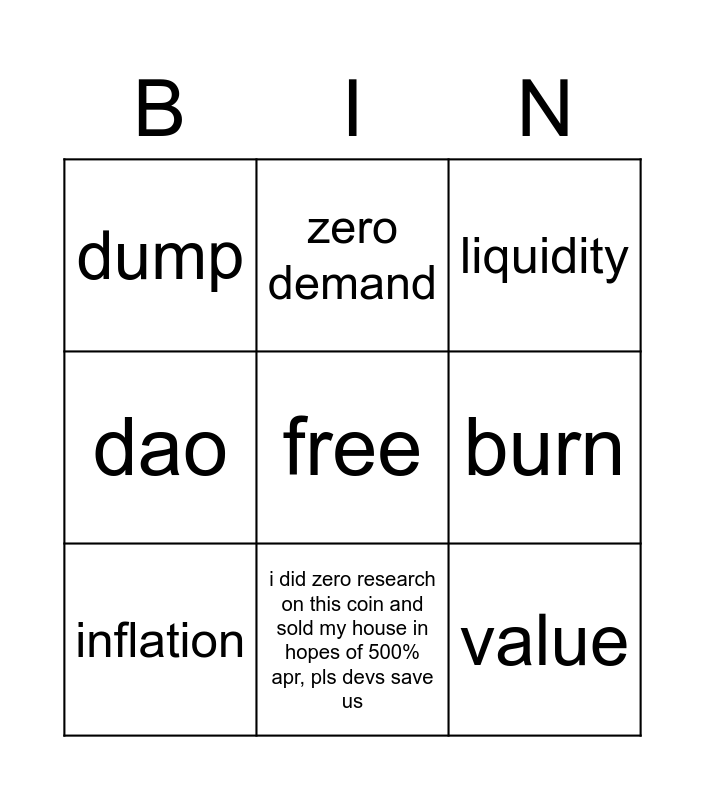 This bingo card has a free space and 8 words: burn, liquidity, zero demand, inflation, dump, value, dao and i did zero research on this coin and sold my house in hopes of 500% apr, pls devs save us.