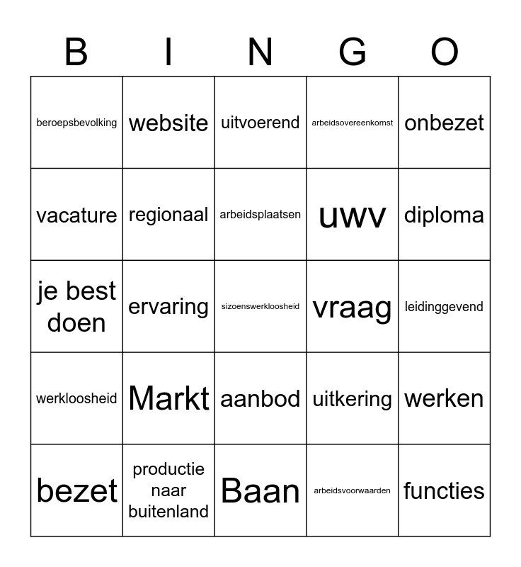 This bingo card has 25 words: Markt, Baan, arbeidsplaatsen, bezet, onbezet, beroepsbevolking, vacature, website, vraag, aanbod, uwv, je best doen, uitkering, werken, regionaal, functies, leidinggevend, uitvoerend, diploma, ervaring, sizoenswerkloosheid, productie naar buitenland, werkloosheid, arbeidsovereenkomst and arbeidsvoorwaarden.