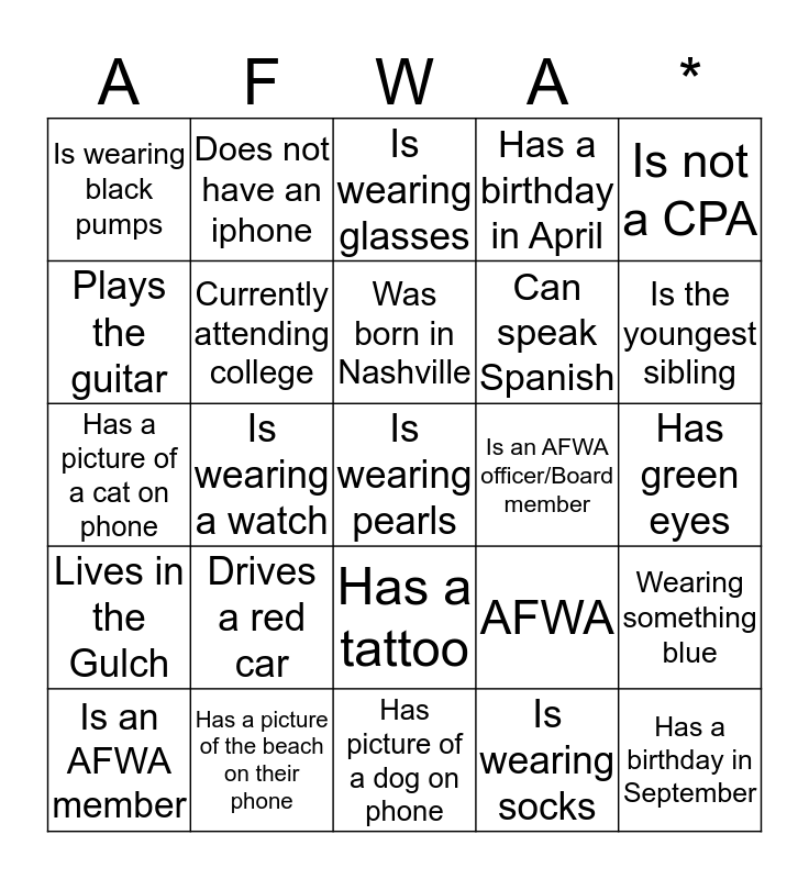 This bingo card has 25 words: Drives a red car, Has picture of a dog on phone, Was born in Nashville, Is an AFWA member, Is not a CPA, Is wearing black pumps, Plays the guitar, Does not have an iphone, Is an AFWA officer/Board member, Has a tattoo, Can speak Spanish, Has a picture of a cat on phone, AFWA, Wearing something blue, Currently attending college, Has a birthday in September, Has green eyes, Is wearing glasses, Is the youngest sibling, Is wearing a watch, Is wearing pearls, Has a picture of the beach on their phone, Lives in the Gulch, Has a birthday in April and Is wearing socks.