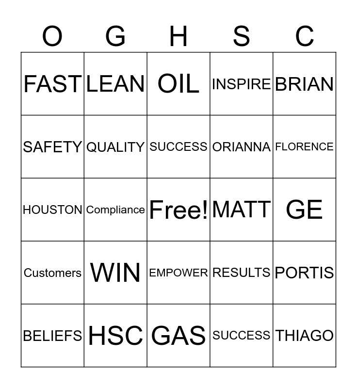 This bingo card has a free space and 24 words: WIN, HSC, SUCCESS, BELIEFS, BRIAN, FAST, SAFETY, LEAN, MATT, EMPOWER, ORIANNA, HOUSTON, RESULTS, PORTIS, QUALITY, SUCCESS, GE, OIL, FLORENCE, Compliance, THIAGO, Customers, INSPIRE and GAS.