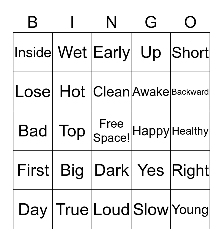 This bingo card has a free space and 24 words: Big, True, Clean, Day, Short, Inside, Lose, Wet, Happy, Dark, Awake, Bad, Yes, Right, Hot, Slow, Healthy, Early, Backward, Top, Young, First, Up and Loud.