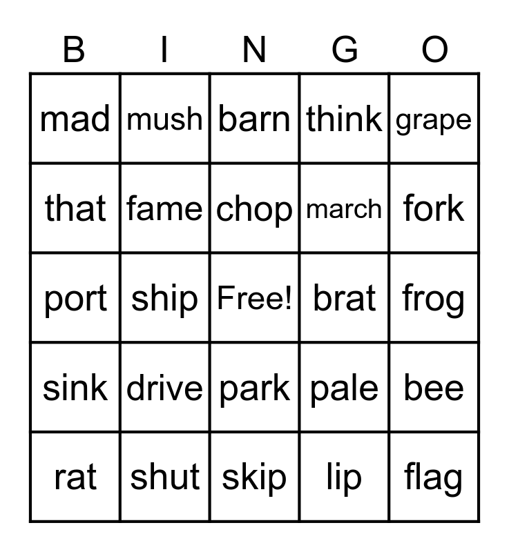 This bingo card has a free space and 24 words: drive, shut, chop, rat, grape, mad, that, mush, brat, park, march, port, pale, bee, fame, lip, frog, barn, fork, ship, flag, sink, think and skip.