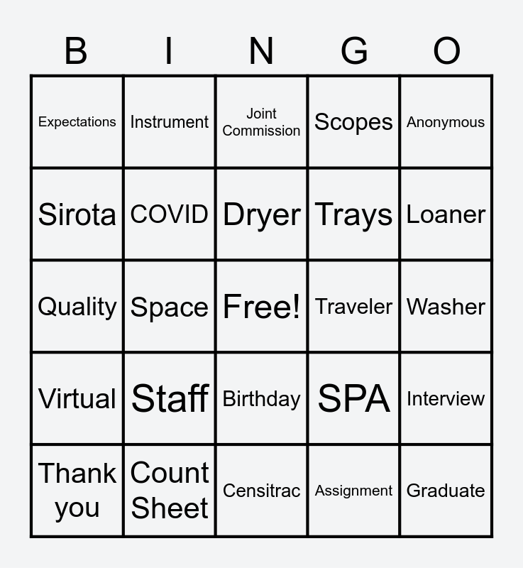 This bingo card has a free space and 29 words: Thank you, Recruitment, Space, Tardy, Expectations, Joint Commission, COVID, Staff, Traveler, Count Sheet, Washer, Graduate, Censitrac, Assignment, Loaner, Core Tech, Birthday, Virtual, Anonymous, Quality, SPA, Errors, Trays, Sirota, Scopes, Instrument, Interview, Dryer and IFU.