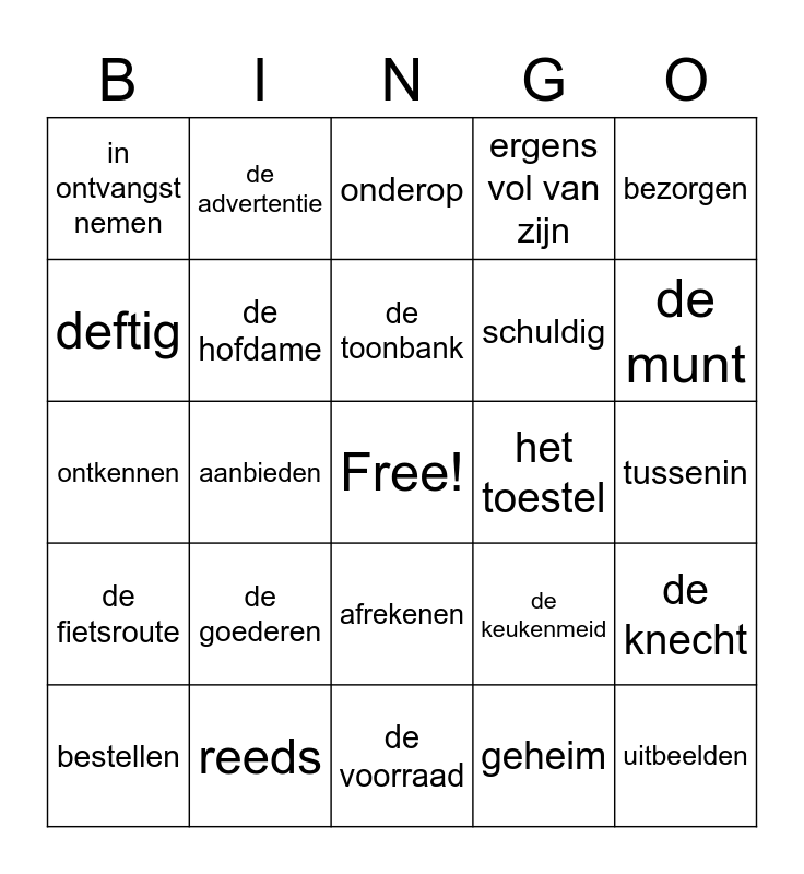 This bingo card has a free space and 25 words: de goederen, de voorraad, de toonbank, bestellen, bezorgen, in ontvangst nemen, deftig, de advertentie, het toestel, afrekenen, schuldig, ontkennen, de keukenmeid, de knecht, de hofdame, bovenop, tussenin, onderop, de munt, aanbieden, uitbeelden, reeds, de fietsroute, ergens vol van zijn and geheim.