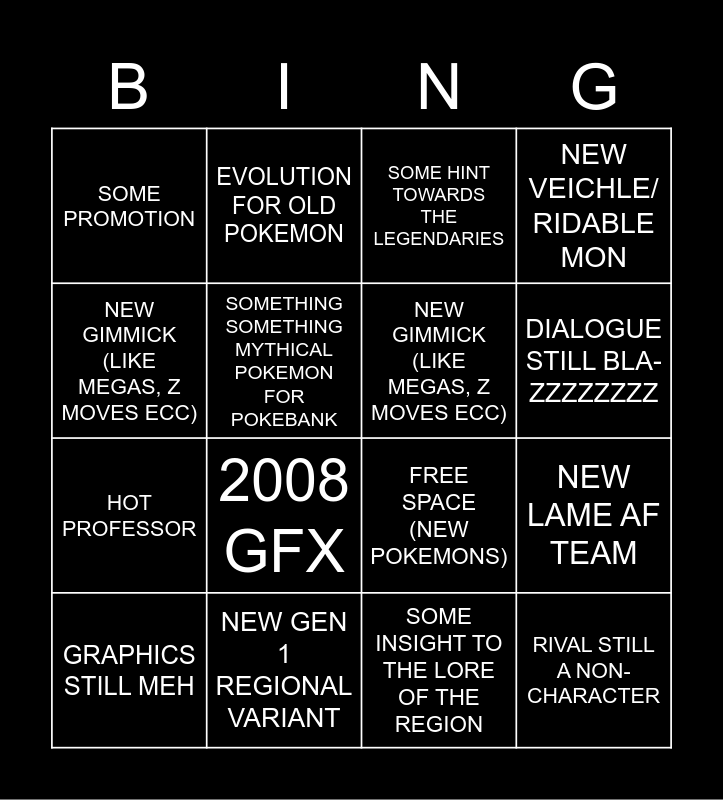 This bingo card has 16 words: NEW GEN 1 REGIONAL VARIANT, NEW LAME AF TEAM, SOME HINT TOWARDS THE LEGENDARIES, SOME PROMOTION, HOT PROFESSOR, EVOLUTION FOR OLD POKEMON, FREE SPACE (NEW POKEMONS), SOME INSIGHT TO THE LORE OF THE REGION, NEW GIMMICK (LIKE MEGAS, Z MOVES ECC), SOMETHING SOMETHING MYTHICAL POKEMON FOR POKEBANK, GRAPHICS STILL MEH, NEW VEICHLE/ RIDABLE MON, 2008 GFX, DIALOGUE STILL BLA-ZZZZZZZZ, NEW GIMMICK (LIKE MEGAS, Z MOVES ECC) and RIVAL STILL A NON-CHARACTER.