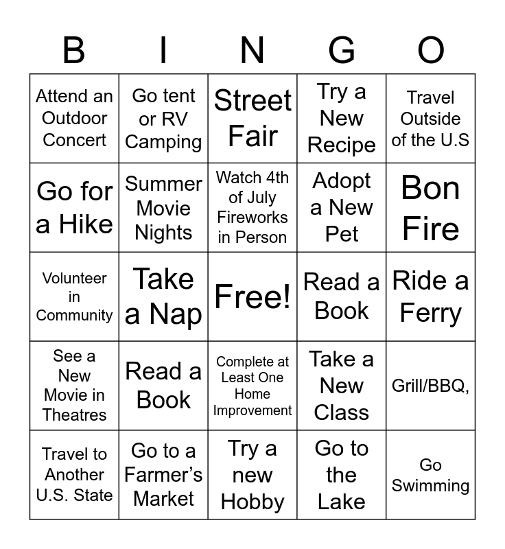 This bingo card has a free space and 24 words: Read a Book, Go to a Farmer’s Market, Watch 4th of July Fireworks in Person, Travel to Another U.S. State, Travel Outside of the U.S, Attend an Outdoor Concert, Go for a Hike, Go tent or RV Camping, Read a Book, Complete at Least One Home Improvement, Adopt a New Pet, Volunteer in Community, Take a New Class, Grill/BBQ,, Summer Movie Nights, Go to the Lake, Ride a Ferry, Street Fair, Bon Fire, Take a Nap, Go Swimming, See a New Movie in Theatres, Try a New Recipe and Try a new Hobby.