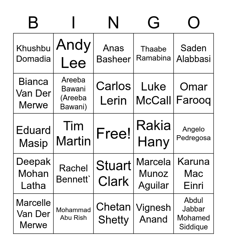 This bingo card has 2 images, a free space and 90 words: Ryan Waltke, José Fainé, Stuart Clark, Nour Abdulsalam, Biju Varghese, Ibrahim Jaber, Saikat Roy, Yousef Alwawi, Samar Hussein, Mahmoud Ezzeldin, Mariam Abu Ebeid, Marise Guirguis, Raj Patel, Angelo Pedregosa, Akashjit Bhau, Carlos Lerin, Sophie Mockett, Yogesh Kale, Miroslav Sopko, Meliza Rodriguez, Dona Javier, Arthi Balasubramanian, Chetan Shetty, Luisa Coelho, Eduard Masip, Mohammad Abu Rish, Shantam Shivam Sharma, Allana Kudtarkar, Djan Javier, Ghani Ansari, Bushra Ashraf, Karuna Mac Einri, Seima Dandan, Deepak Mohan Latha, Khushbu Domadia, Thaabe Ramabina, Anas Basheer, Joyce Jarjoura, Tim Martin, Omar Farooq, Marcelle Van Der Merwe, Bianca Van Der Merwe, Nadine Zein, Jana Gharazeddine, Adelino Enriquez, Marcela Munoz Aguilar, Diane Thorsen, Sarvnaz Amidi, Angel Villanueva, Julijana Mitic, Alan Crystal, Luke McCall, Steven Greenberg, Zahrin Judith D'Silva, Doyin Anyanwu, Nagham Ewaiwi, Rakia Hany, Maria Perianes, Ali Jumani, Mena Ahmed, Nour Toubia, Pablo Nunez, Zlatan Pejdah, Moza Al Kamda, Rithika Suresh, Gareth Cain, Pari Sanghavi, Vignesh Anand, Adam Naeem, Yasmine Fahmy, Rachel Bennett`, Abdul Jabbar Mohamed Siddique, Nikita Kashyap, Carla Donato, Andy Lee, Areeba Bawani (Areeba Bawani), Julius Cabias (Julius Frelan Cabias), Rami Amhaz, Amle Yousef, Ghada Maamoun, Hessa Mohammad, Saden Alabbasi, Ken Rasonable, Jithu Mathews, Mohammad Khazendar, Nigel Rosario, Aneeta Rose Pius, Tanseera Muhammed, Jad Alawar and Esteban Filippa Vincenti.