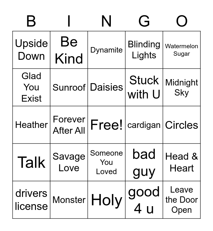 This bingo card has a free space and 45 words: Levitating, Leave the Door Open, Peaches, drivers license, Butter, good 4 u, Dynamite, Hold On, Watermelon Sugar, Monster, Blinding Lights, cardigan, Someone You Loved, Savage Love, Beautiful Mistakes, Holy, Rain on Me, Heather, Don't Start Now, Midnight Sky, Be Kind, Yummy, Therefore I Am, Upside Down, I Don't Care, Circles, Sucker, Old Town Road, bad guy, Talk, willow, Head & Heart, Something About Ya, Save Your Tears, Astronaut in the Ocean, Forever After All, Mood, Nobody, The Good Ones, Daisies, Glad You Exist, Stuck with U, As it was, Sunroof and About **** Time.