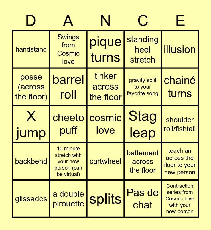 This bingo card has a free space and 24 words: 10 minute stretch with your new person (can be virtual), a double pirouette, tinker across the floor, glissades, illusion, handstand, posse (across the floor), Swings from Cosmic love, Stag leap, cartwheel, gravity split to your favorite song, X jump, battement across the floor, teach an across the floor to your new person, barrel roll, Pas de chat, shoulder roll/fishtail, pique turns, chainé turns, cheeto puff, Contraction series from Cosmic love with your new person, backbend, standing heel stretch and splits.