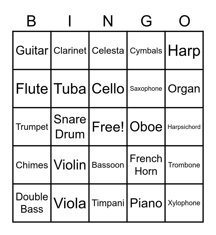 This bingo card has a free space and 24 words: Violin, Viola, Cello, Double Bass, Harp, Guitar, Flute, Clarinet, Oboe, Bassoon, Saxophone, Trumpet, French Horn, Trombone, Tuba, Piano, Harpsichord, Celesta, Organ, Snare Drum, Xylophone, Chimes, Cymbals and Timpani.