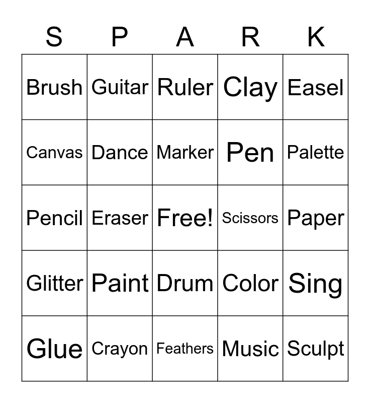 This bingo card has a free space and 24 words: Paint, Crayon, Marker, Glue, Easel, Brush, Canvas, Guitar, Scissors, Drum, Pen, Pencil, Color, Sing, Dance, Music, Paper, Ruler, Palette, Eraser, Sculpt, Glitter, Clay and Feathers.
