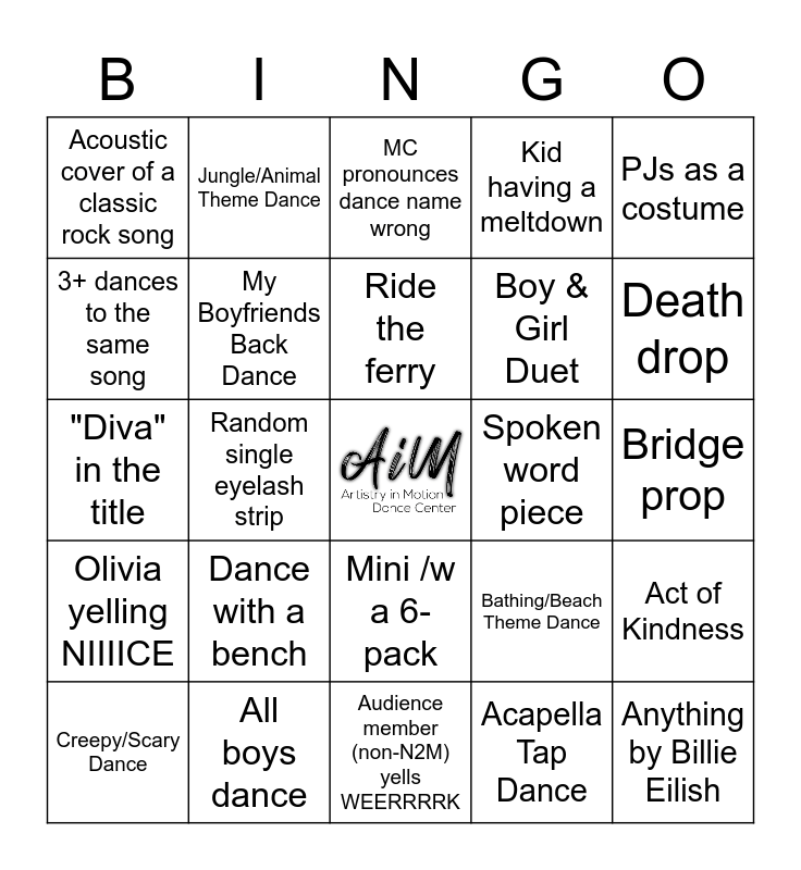 This bingo card has a free space and 28 words: Act of Kindness, Chris talks to you, Boy & Girl Duet, Acapella Tap Dance, 3+ dances to the same song, MC pronounces dance name wrong, Jungle/Animal Theme Dance, Olivia yelling NIIIICE, Spoken word piece, Creepy/Scary Dance, "Diva" in the title, Kid having a meltdown, All boys dance, Audience member (non-N2M) yells WEERRRRK, Death drop, Addison Napping, Dance with a bench, My Boyfriends Back Dance, Ride the ferry, Mini /w a 6-pack, Acoustic cover of a classic rock song, Knee brace, Anything by Billie Eilish, Random single eyelash strip, Bridge prop, Bathing/Beach Theme Dance, PJs as a costume and Same costume as us.