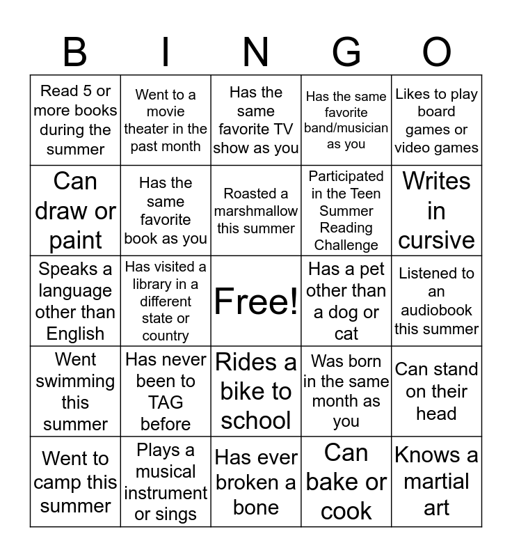 This bingo card has a free space and 24 words: Has never been to TAG before, Plays a musical instrument or sings, Roasted a marshmallow this summer, Went to camp this summer, Likes to play board games or video games, Read 5 or more books during the summer, Can draw or paint, Went to a movie theater in the past month, Has a pet other than a dog or cat, Rides a bike to school, Participated in the Teen Summer Reading Challenge, Speaks a language other than English, Was born in the same month as you, Can stand on their head, Has the same favorite book as you, Can bake or cook, Listened to an audiobook this summer, Has the same favorite TV show as you, Writes in cursive, Has visited a library in a different state or country, Knows a martial art, Went swimming this summer, Has the same favorite band/musician as you and Has ever broken a bone.