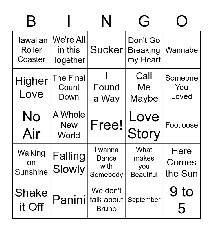 This bingo card has a free space and 31 words: We don't talk about Bruno, Hakuna Matata, A Whole New World, In Summer, Hawaiian Roller Coaster, Sucker, The Final Count Down, What makes you Beautiful, Love Story, September, Footloose, 9 to 5, Who Says, Rainbow, Someone You Loved, If I Ain't Got You, Here Comes the Sun, Falling Slowly, Walking on Sunshine, I wanna Dance with Somebody, Wannabe, Intentions, Shake it Off, We're All in this Together, Call Me Maybe, Higher Love, Don't Go Breaking my Heart, No Air, Panini, I Found a Way and good 4 u.