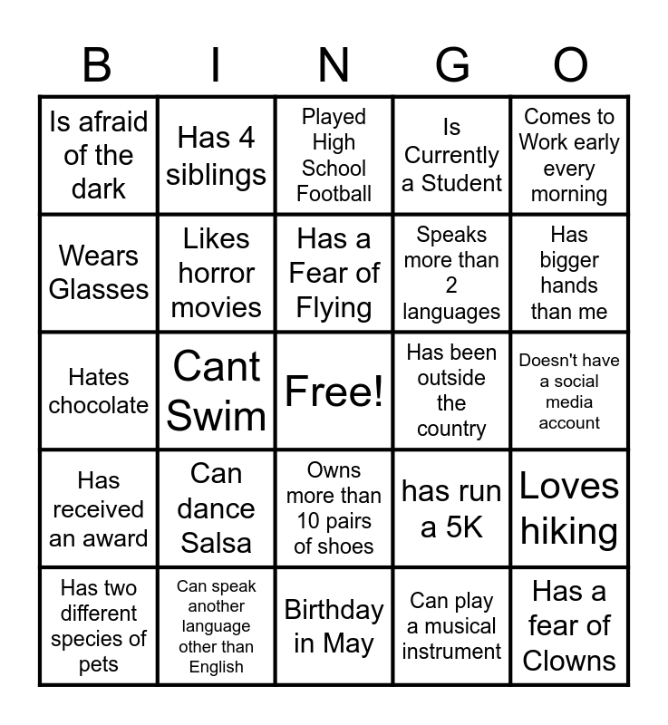 This bingo card has a free space and 24 words: Can dance Salsa, Can speak another language other than English, Has a Fear of Flying, Has two different species of pets, Comes to Work early every morning, Is afraid of the dark, Wears Glasses, Has 4 siblings, Has been outside the country, Owns more than 10 pairs of shoes, Speaks more than 2 languages, Hates chocolate, has run a 5K, Loves hiking, Likes horror movies, Can play a musical instrument, Doesn't have a social media account, Played High School Football, Has bigger hands than me, Cant Swim, Has a fear of Clowns, Has received an award, Is Currently a Student and Birthday in May.
