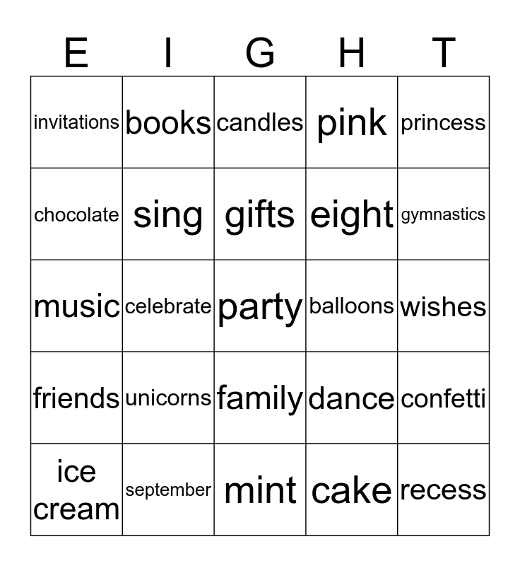 This bingo card has 25 words: unicorns, mint, gifts, ice cream, princess, invitations, chocolate, books, balloons, family, eight, music, dance, confetti, sing, recess, wishes, candles, gymnastics, celebrate, party, september, friends, pink and cake.