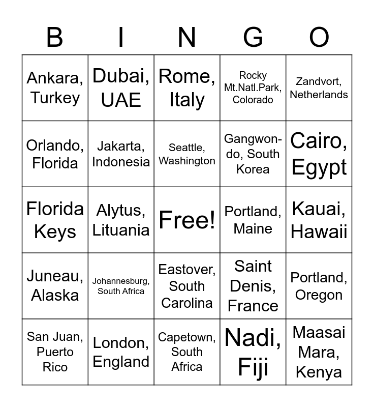 This bingo card has a free space and 37 words: Madison, Wisconsin, Madrid, Spain, Sao Paulo, Brazil, Jakarta, Indonesia, Portland, Oregon, Johannesburg, South Africa, Seattle, Washington, Sonaron Desert, Arizon, Zandvort, Netherlands, Rio de Janeiro, Brazil, Alytus, Lituania, Rocky Mt.Natl.Park, Colorado, Maasai Mara, Kenya, Kauai, Hawaii, Orlando, Florida, Juneau, Alaska, Sydney, Australia, Rome, Italy, Eastover, South Carolina, Portland, Maine, Ankara, Turkey, Cairo, Egypt, San Juan, Puerto Rico, Capetown, South Africa, Lviv, Ukraine, Nadi, Fiji, Dubai, UAE, Chapel Hill, NC, Berkeley, California, Immokalee, Florida, Pantanal, Brazil, London, England, Florida Keys, Jakarta, Indonesia, Saint Denis, France, Gangwon-do, South Korea and Bogota, Columbia.