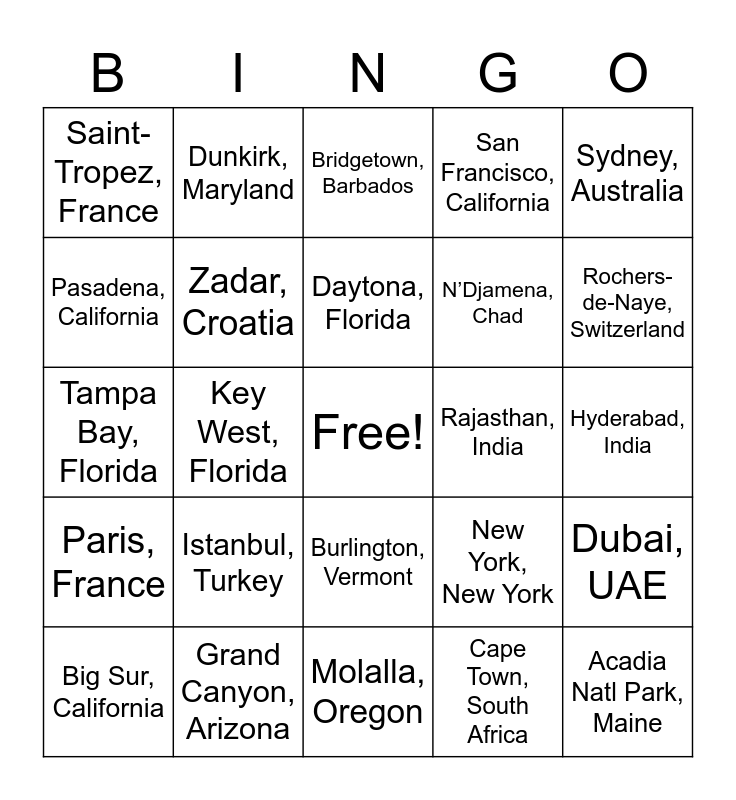 This bingo card has a free space and 36 words: West Yellowstone, Montana, Badlands Natl. Park, South Dakota, Puerto Natales, Chile, Zadar, Croatia, New York, New York, Paris, France, Daytona, Florida, Rome, Italy, Sydney, Australia, Boston, Massachusetts, Key West, Florida, San Francisco, California, London, UK, Rajasthan, India, Rochers-de-Naye, Switzerland, Saint-Tropez, France, Kailua Beach, Hawaii, Istanbul, Turkey, Acadia Natl Park, Maine, Bridgetown, Barbados, Hyderabad, India, Dubai, UAE, Grand Canyon, Arizona, Big Sur, California, Molalla, Oregon, Dunkirk, Maryland, Tampa Bay, Florida, Hot Springs, South Dakota, N’Djamena, Chad, Pasadena, California, Dallas, Texas, Minneapolis, Minnesota, Cape Town, South Africa, Burlington, Vermont, Tokyo, Japan and Orlando, Florida.