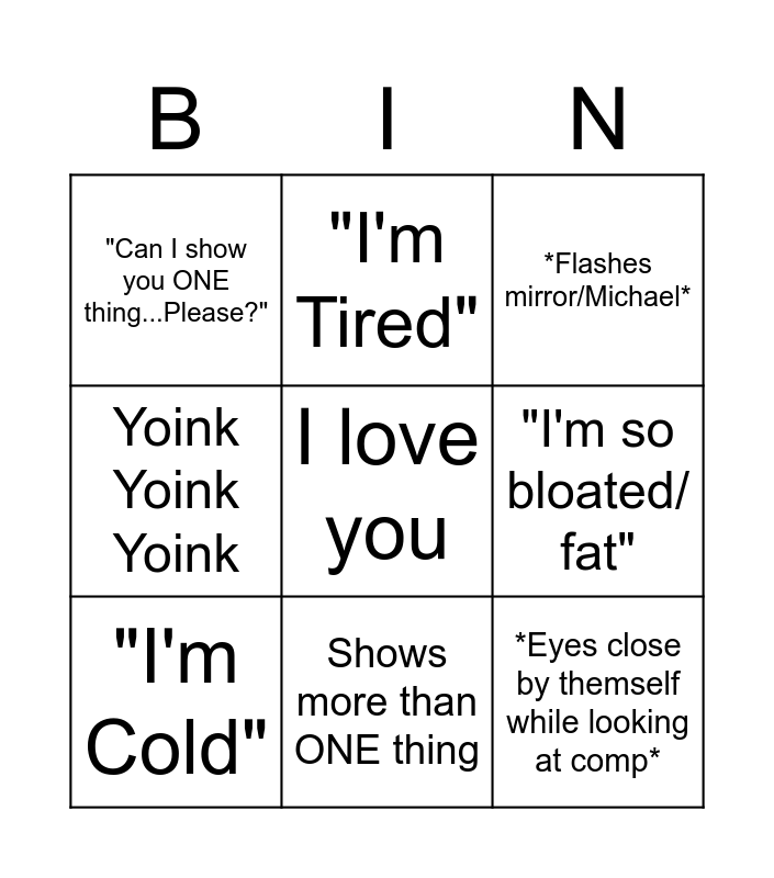 This bingo card has a free space and 9 words: "I'm Cold", "I'm Tired", "I'm so bloated/ fat", "Can I show you ONE thing...Please?", *Flashes mirror/Michael*, Yoink Yoink Yoink, Shows more than ONE thing, *Eyes close by themself while looking at comp* and *eyes close by themselves*.