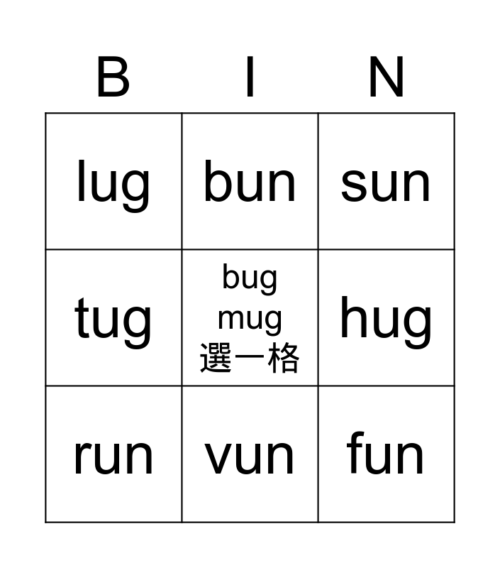 This bingo card has a free space and 8 words: hug, sun, bun, run, lug, fun, tug and vun.