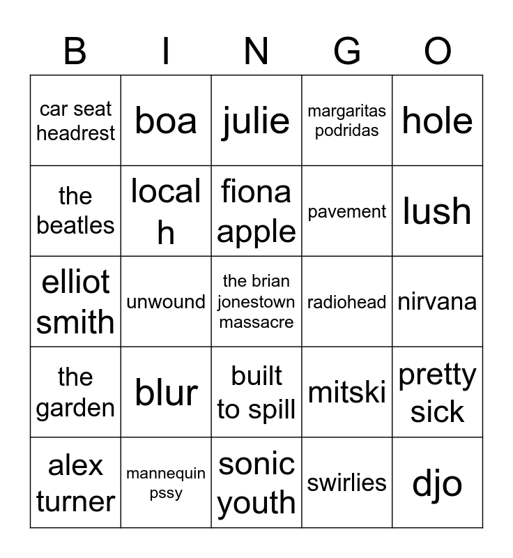 This bingo card has 25 words: blur, sonic youth, fiona apple, alex turner, hole, car seat headrest, the beatles, boa, radiohead, built to spill, pavement, elliot smith, mitski, pretty sick, local h, djo, nirvana, julie, lush, unwound, the brian jonestown massacre, mannequin pssy, the garden, margaritas podridas and swirlies.