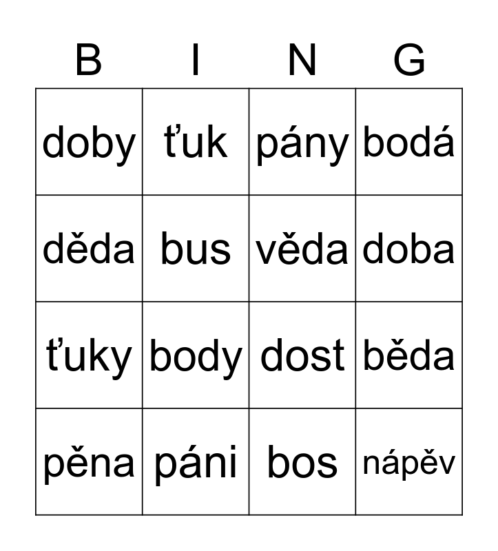 This bingo card has 16 words: páni, běda, pány, doby, ťuky, ťuk, dost, bos, děda, bus, pěna, bodá, body, doba, věda and nápěv.