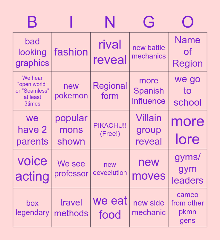 This bingo card has a free space and 24 words: box legendary, We see professor, Regional form, new side mechanic, Name of Region, bad looking graphics, fashion, rival reveal, Villain group reveal, more lore, we have 2 parents, new pokemon, new moves, gyms/ gym leaders, We hear "open world" or "Seamless" at least 3times, travel methods, we eat food, new battle mechanics, we go to school, voice acting, popular mons shown, new eeveelution, more Spanish influence and cameo from other pkmn gens.