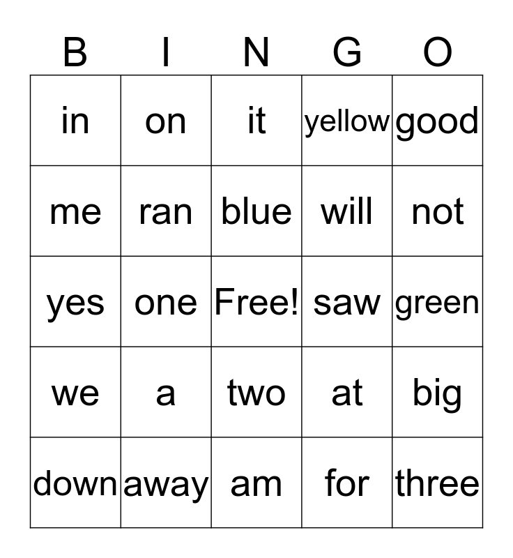 This bingo card has a free space and 24 words: a, away, blue, down, good, in, me, on, saw, two, will, yes, at, big, ran, for, green, it, not, one, three, we, yellow and am.