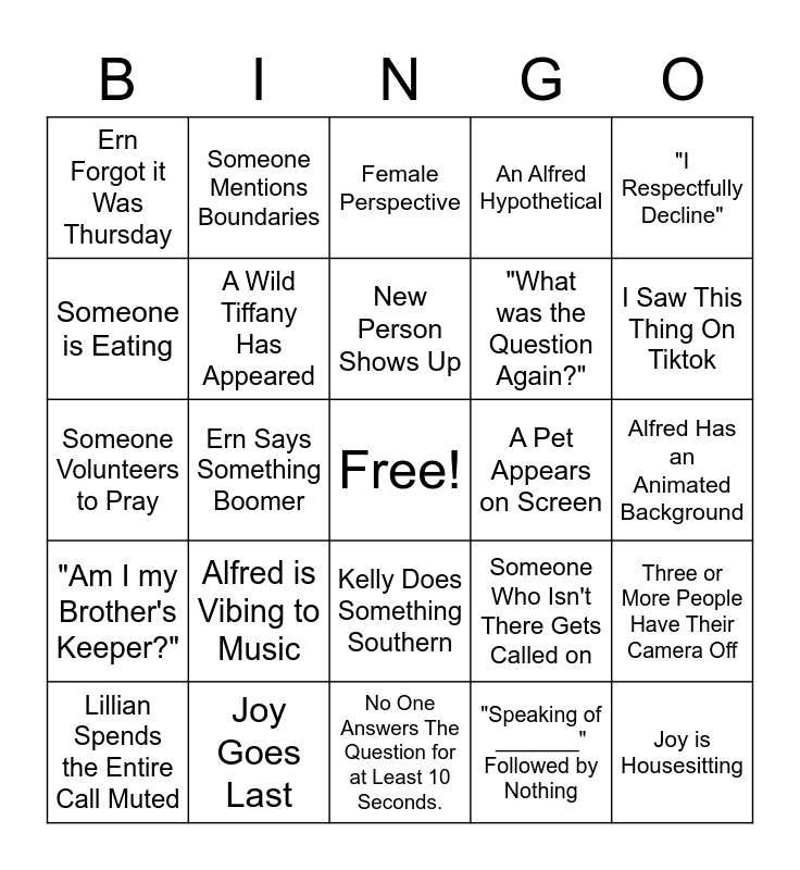 This bingo card has a free space and 24 words: Alfred is Vibing to Music, Joy Goes Last, New Person Shows Up, Lillian Spends the Entire Call Muted, "I Respectfully Decline", Ern Forgot it Was Thursday, Someone is Eating, Someone Mentions Boundaries, A Pet Appears on Screen, Kelly Does Something Southern, "What was the Question Again?", Someone Volunteers to Pray, Someone Who Isn't There Gets Called on, Three or More People Have Their Camera Off, A Wild Tiffany Has Appeared, "Speaking of _______" Followed by Nothing, Alfred Has an Animated Background, Female Perspective, I Saw This Thing On Tiktok, Ern Says Something Boomer, Joy is Housesitting, "Am I my Brother's Keeper?", An Alfred Hypothetical and No One Answers The Question for at Least 10 Seconds..
