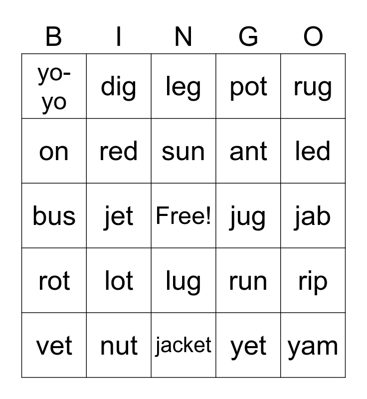 This bingo card has a free space and 31 words: jacket, jam, jet, yellow, yo-yo, leg, red, run, jug, yet, jab, yam, rap, lap, led, lip, rip, lot, rot, lug, rug, pen, vet, dig, ant, on, pot, bus, nut, sun and up.
