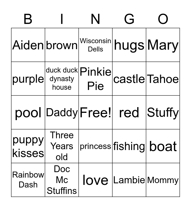 This bingo card has a free space and 24 words: Three Years old, Doc Mc Stuffins, Pinkie Pie, Rainbow Dash, Mary, Aiden, purple, brown, red, princess, castle, pool, fishing, boat, duck duck dynasty house, Lambie, Stuffy, Wisconsin Dells, Tahoe, Daddy, Mommy, puppy kisses, hugs and love.