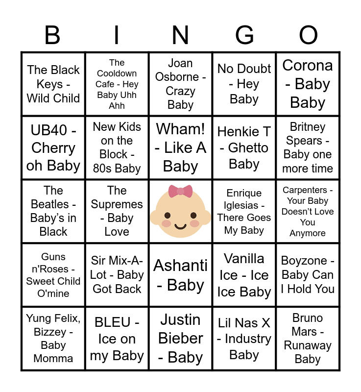 This bingo card has a free space and 32 words: Lil Nas X - Industry Baby, The Ronettes - Be My Baby, The Supremes - Baby Love, VanVelzen - Baby Get Higher, Guns n'Roses - Sweet Child O'mine, New Kids on the Block - 80s Baby, Corona - Baby Baby, Boyzone - Baby Can I Hold You, The Cooldown Cafe - Hey Baby Uhh Ahh, Surf Mesa - ily, Wham! - Like A Baby, Joan Osborne - Crazy Baby, Haddaway - What is Love, Bakermat - Baby, Enrique Iglesias - There Goes My Baby, Beyoncé - Baby Boy, Yung Felix, Bizzey - Baby Momma, The Beatles - Baby’s in Black, Ashanti - Baby, Sir Mix-A-Lot - Baby Got Back, Vanilla Ice - Ice Ice Baby, John Legend - Where Did My Baby Go, Carpenters - Your Baby Doesn’t Love You Anymore, BLEU - Ice on my Baby, Bruno Mars - Runaway Baby, No Doubt - Hey Baby, Henkie T - Ghetto Baby, UB40 - Cherry oh Baby, The Black Keys - Wild Child, Justin Bieber - Baby, Baby shark and Britney Spears - Baby one more time.