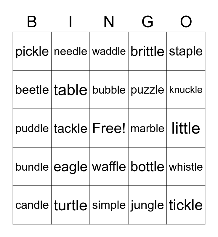 This bingo card has a free space and 24 words: eagle, turtle, bubble, candle, staple, pickle, beetle, needle, marble, waffle, puzzle, puddle, bottle, whistle, table, jungle, little, waddle, knuckle, tackle, tickle, bundle, brittle and simple.