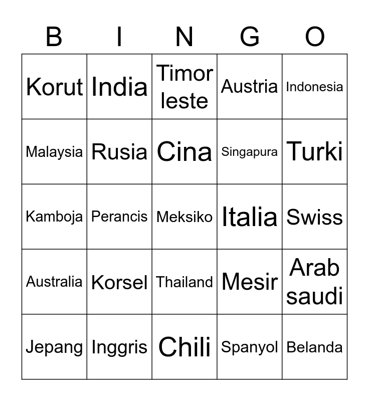 This bingo card has a free space and 24 words: Korsel, Inggris, Cina, Jepang, Indonesia, Korut, Malaysia, India, Italia, Thailand, Singapura, Kamboja, Mesir, Arab saudi, Rusia, Spanyol, Swiss, Timor leste, Turki, Perancis, Belanda, Australia, Austria and Chili.